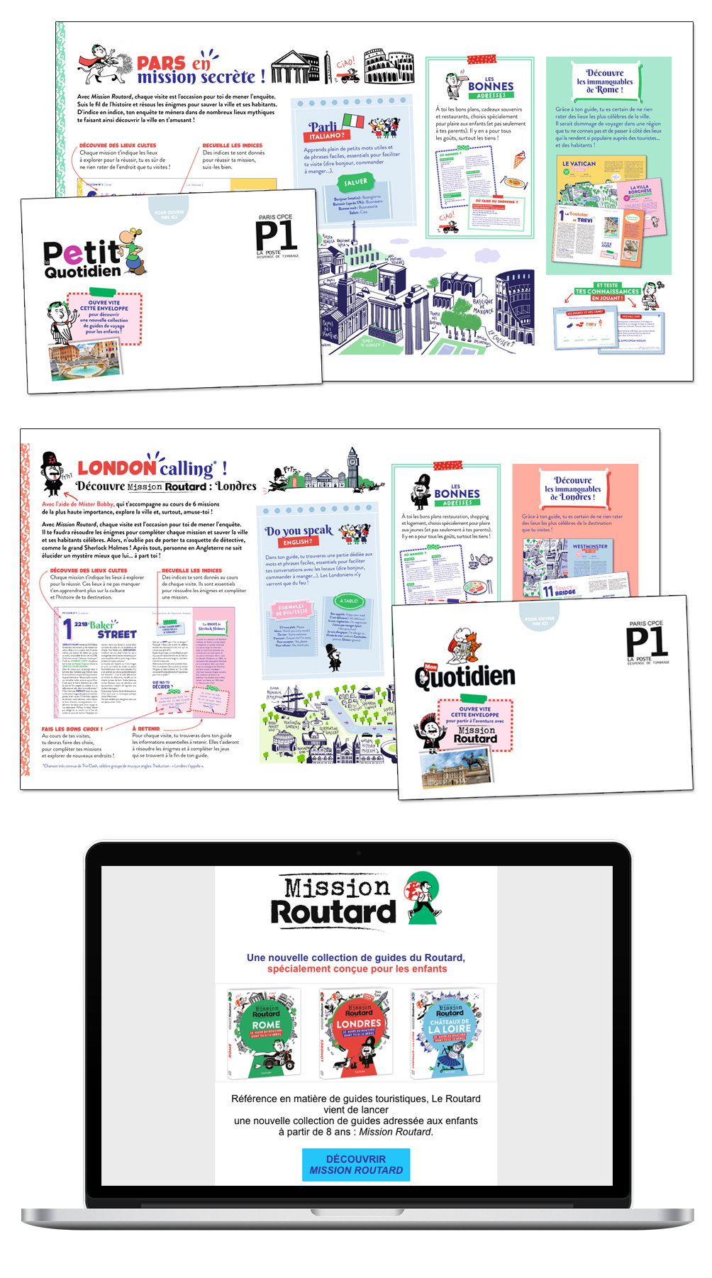 Au printemps 2024, les célèbres guides du Routard ont élargi leur potentiel avec une nouvelle collection adressée aux enfants : Mission Routard. Ces guides spécialement conçus pour ce jeune public sont un format hybride, comprenant à la fois une multitude d'infos pratiques et de conseils sur les destinations, et un volet "histoire et enquête" dans laquelle le lecteur, lui-même, devient le guide... à la façon d'un "livre dont vous êtes le héros".