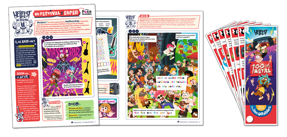 - Conception d’un livret de 4 pages avec des jeux et infos pour faire découvrir les musiques extrêmes en s’amusant et obtenir son ticket d’entrée au Hellfest Kids.